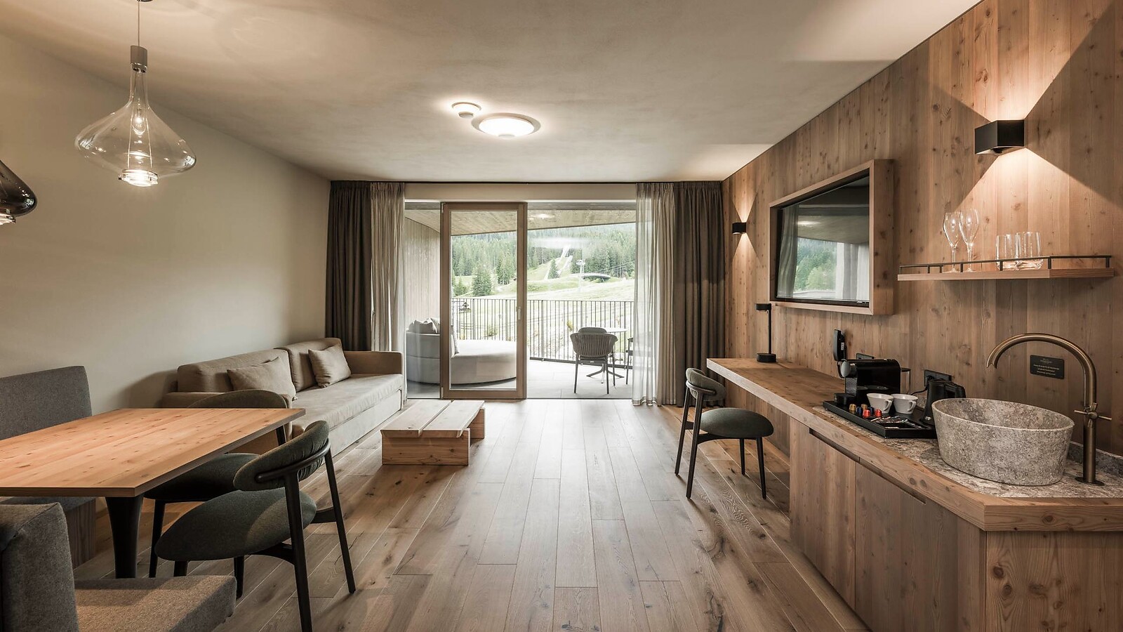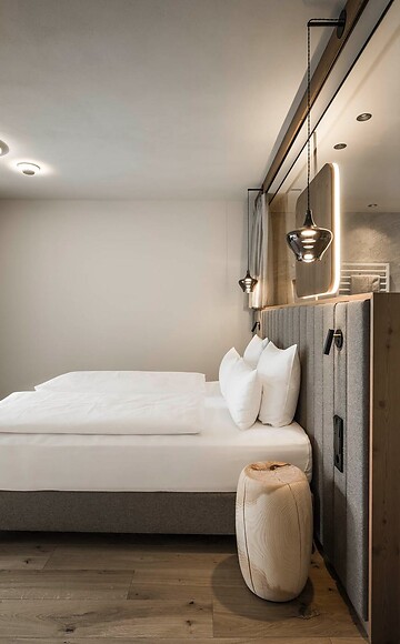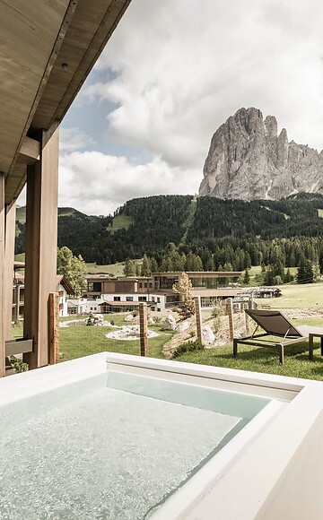 Unser Highlight. Edle und naturbelassene Materialien aus unserer Umgebung spiegeln die Schönheit der Natur wider. Genießen Sie Ihren Aufenthalt in der Alpine Silence Suite mit getrenntem- Wohn und Schlafbereich und eigener Sauna. Entspannen Sie in Ihrem privaten Gartenbereich mit Wellnessliegen und Designer-Whirlpool, mit atemberaubender Aussicht auf das Langkofelmassiv und die Grödner Dolomiten. Besonders komfortabel: Durch den privaten Ski/ und Bikeraum beginnen wunderbare Skitage und aufregende Bike-Touren direkt von Ihrem Zimmer aus.