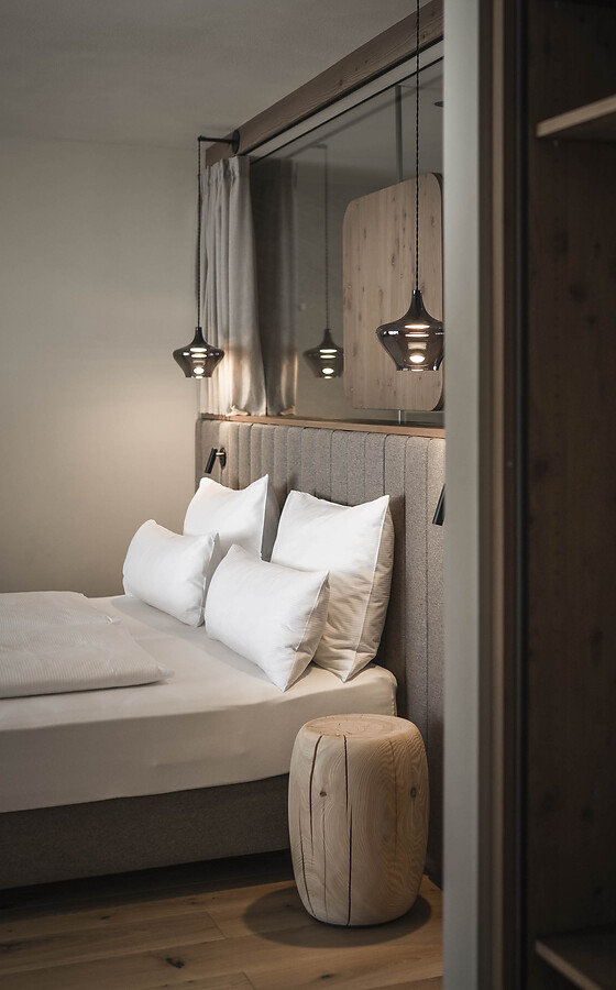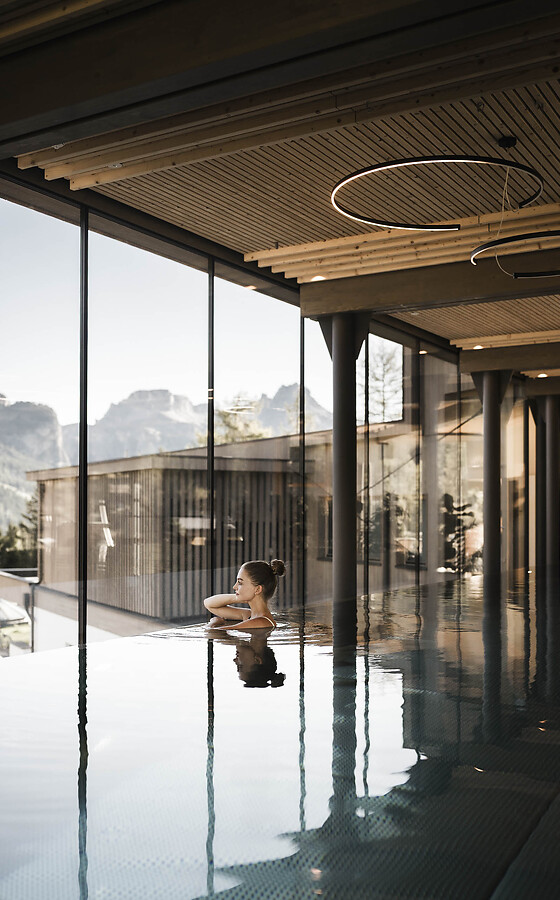 The new garden world proves that it doesn't take much to relax. Nature is itself the most effective wellness area. The purest mountain air fills my lungs, fresh mountain spring water refreshes me to the core. The Langkofel and Plattkofel rise up majestically on the horizon as I drift away on the calming waves of the new Sky Pool. The saunas and relaxation areas work their magic and take me into a world of well-being.