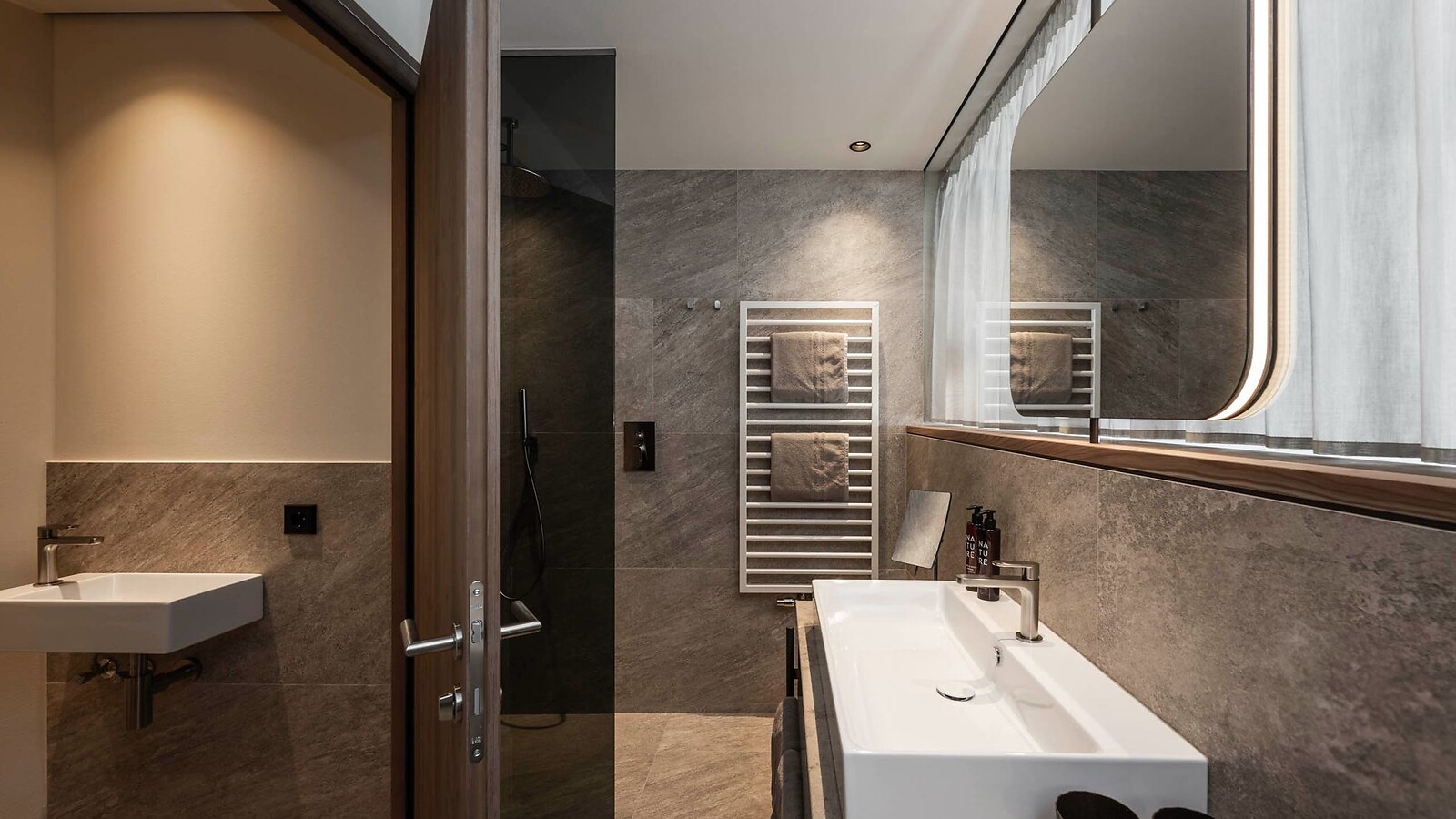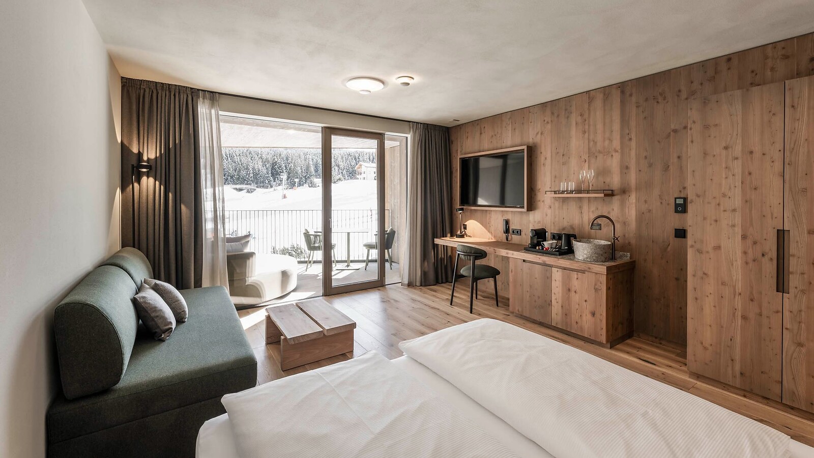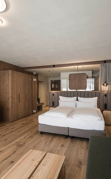 The lines and colours of the surrounding nature are captured in the design of the room. When you wake up, you can enjoy a breathtaking view through the large windows, directly from the bed. The panorama terrace with suspended wellness lounger invites you to linger and admire the landscape.