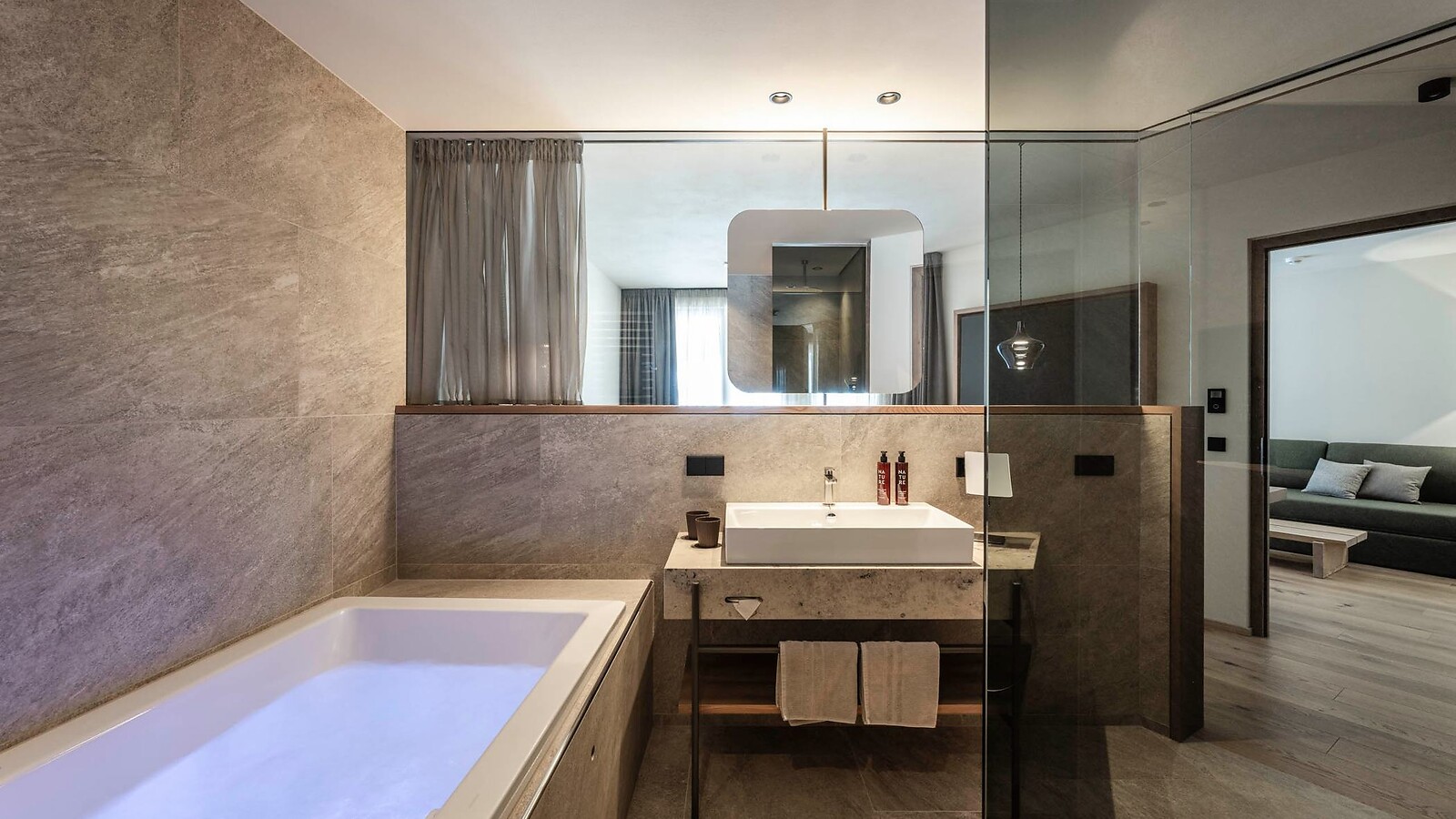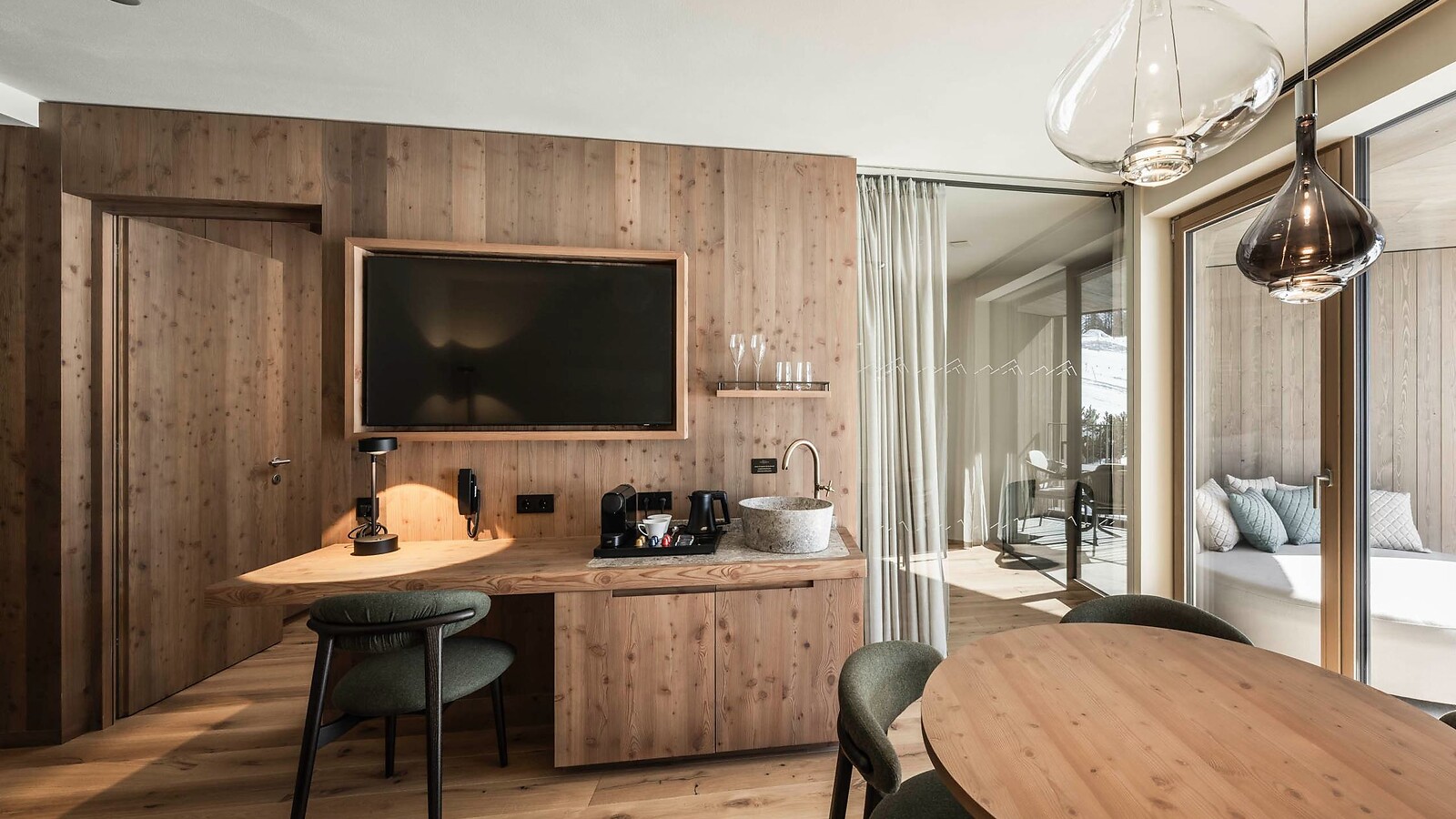 An elegant suite with a comfortable space, perfect to turn your stay into an unforgettable one. With two separate rooms and large windows, it offers a delightful view of our wellness garden and the Sassolungo.