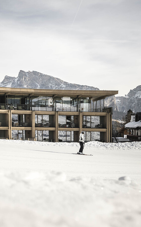 Quando le Dolomiti si assopiscono sotto una coltre di neve, il mio cuore inizia a battere più forte. Nel deposito sci, mi infilo gli scarponi già riscaldati e indosso gli sci. Salgo sull’impianto di risalita dell’hotel per raggiungere il cuore del carosello sciistico più grande d’Europa. La ciliegina sulla torta? È possibile accedere alla Sella Ronda direttamente dall’hotel. Oltre alle piste da sci, davanti all’hotel passano anche la piste da fondo e i sentieri escursionistici invernali.