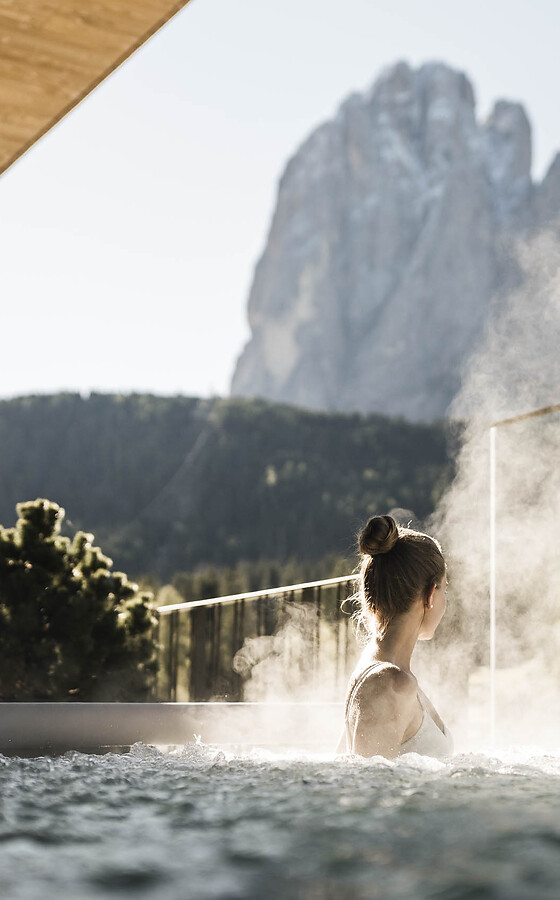 Il nuovo giardino dimostra che non serve molto per rilassarsi. La natura stessa è l’area benessere più efficace di tutte. L’aria pura di montagna mi riempie i polmoni, l’acqua fresca di sorgente mi rinfresca nel profondo. Il Sassolungo e il Sassopiatto fanno capolino all’orizzonte, mentre io mi lascio trasportare dalle onde calme della nuova Skypool. Le saune e le aree relax conservano la loro magia e mi trasportano in un mondo di benessere.